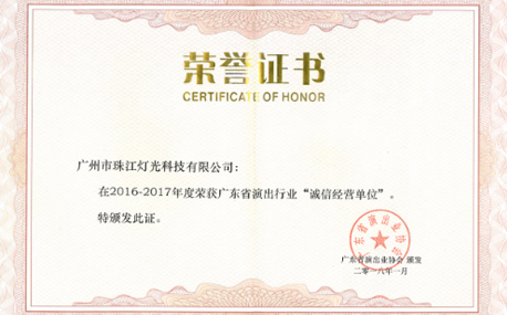 12月26日,廣東省文化廳、廣東省演出業(yè)協(xié)會(huì)對(duì)2019年廣東省演出行業(yè)“誠(chéng)信單位”評(píng)選結(jié)果進(jìn)行公示,珠江燈光再次榮獲“誠(chéng)信經(jīng)營(yíng)單位”稱號(hào)。