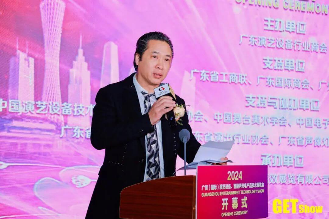 廣東演藝設備行業(yè)商會會長、珠江燈光董事長梁志遠代表商會發(fā)表致辭,他表示市場需求就是最好的風向標,2024年GETshow全新綻放,從保利展館搬遷至廣交會展館D區(qū),展覽時間更合適,展覽空間也更優(yōu)化。今年的GET Show緊跟產(chǎn)業(yè)發(fā)展趨勢,不僅集中展示全球近千個優(yōu)秀品牌的新技術新產(chǎn)品,還充分釋放廣東作為全球演藝設備產(chǎn)業(yè)集群的優(yōu)勢,吸引了產(chǎn)業(yè)鏈上下游相關組織、高等院校、國內(nèi)外知名專家匯聚一堂,圍繞“產(chǎn)品+場景”、“產(chǎn)品+設計”、“產(chǎn)品+服務”等交流互動,預祝大家未來四天觀展愉快,收獲滿滿。