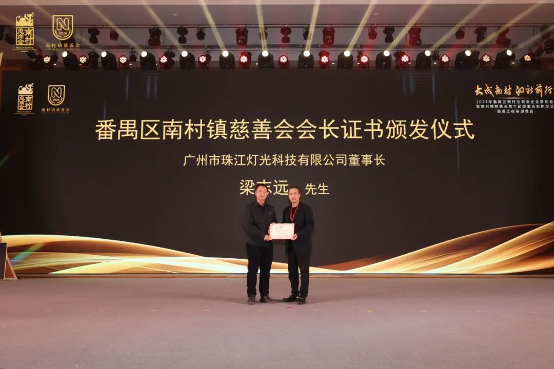 大會上,珠江燈光梁志遠董事長榮任南村鎮慈善會新一屆會長,南村鎮黨委副書記陸志剛親自頒發證書,并合影留念。