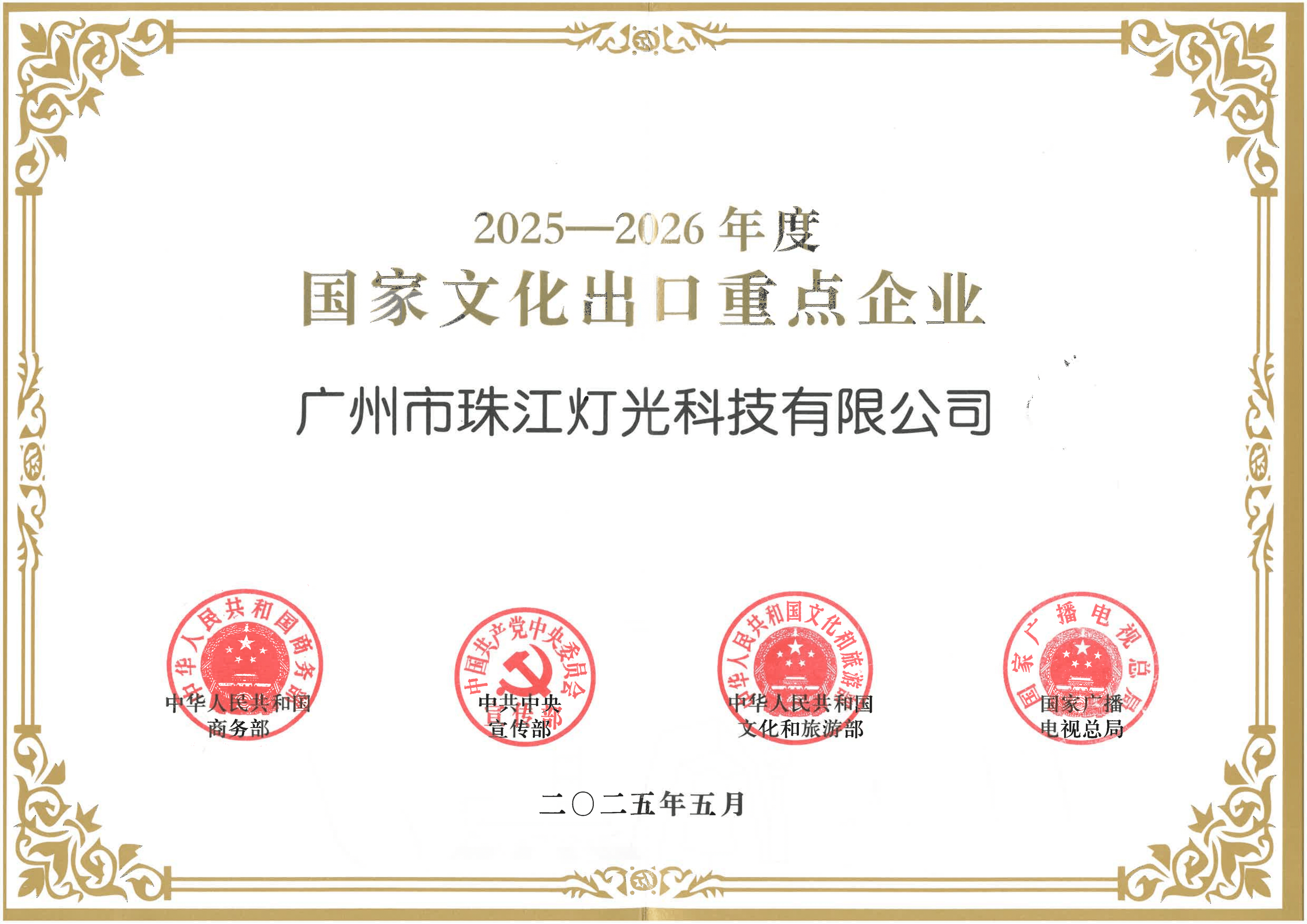 日前,由商務部、中央宣傳部、文化和旅游部、廣電總局共同認定的《2025-2026年度國家文化出口重點企業和重點項目名單》對外公布,珠江燈光榮列其中。